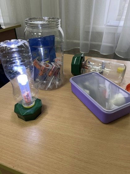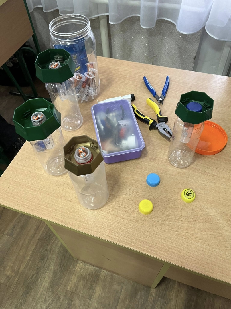 Для створення корпусів ліхтариків були використані поліетиленові пляшки, пластикові кришечки та корпуси шприців, надавши друге життя матеріалам, які зазвичай потрапляють у сміття. Такий підхід допоміг учням усвідомити важливість повторного використання ресурсів і зменшення негативного впливу на довкілля.