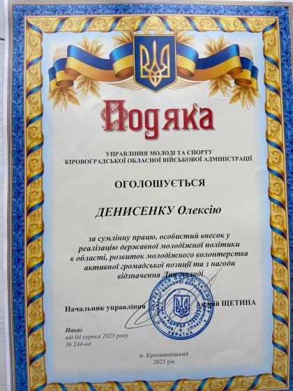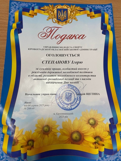 За сумлінну працю, активну громадську позицію, розвиток молодіжного волонтерського руху та вагомий внесок у реалізацію державної молодіжної політики в області, управління молоді та спорту Кіровоградської обласної державної адміністрації відзначило наших учнів: